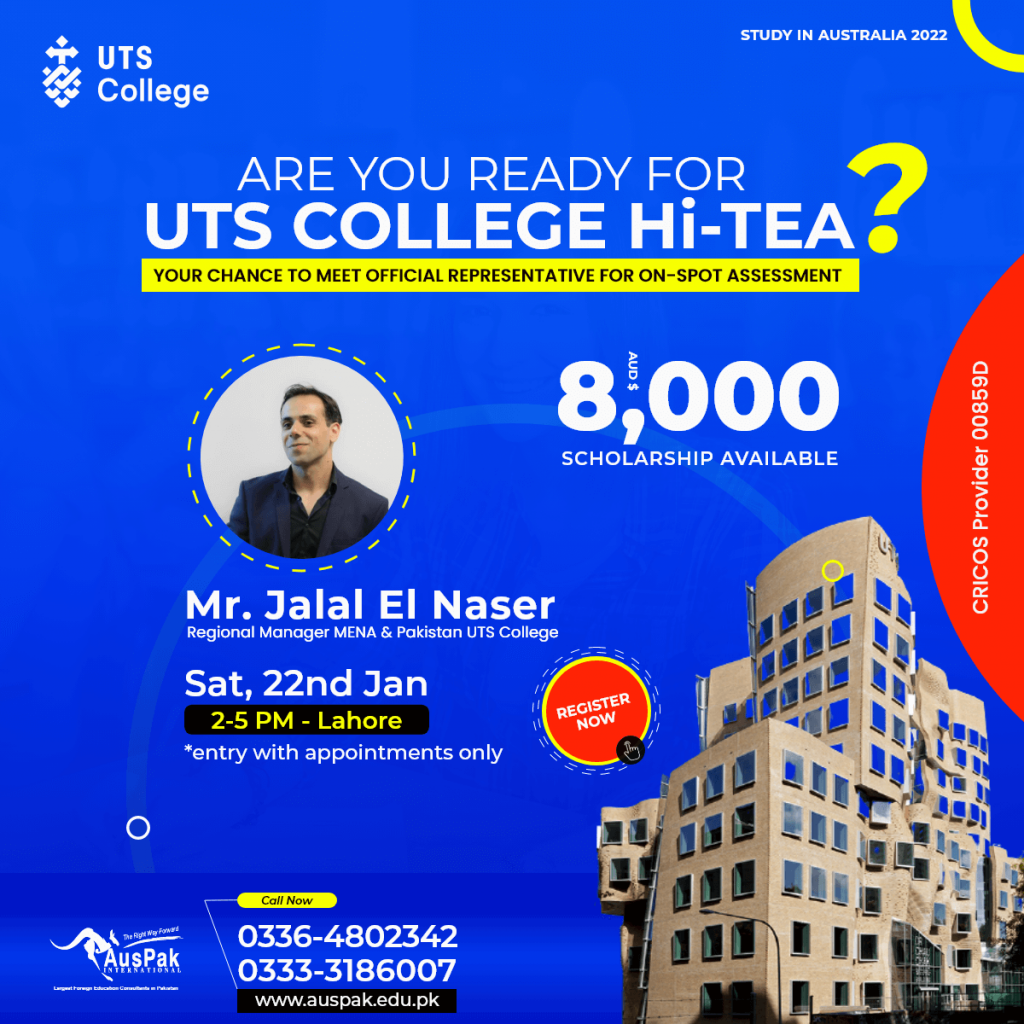 \AusPak International brings yet another opportunity for students to Meet with UTS College official representative Mr. Jalal El Naser (Regional Manager MENA & Pakistan) over a Hi-Tea in Lahore on Sat, 22nd Jan between 2-5 PM